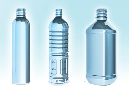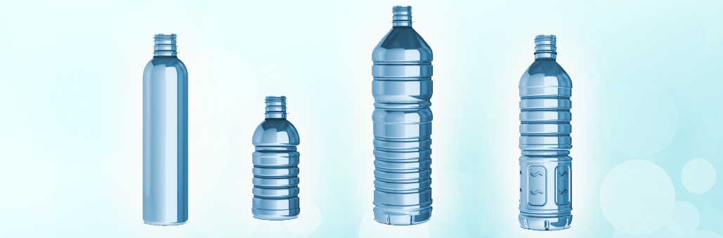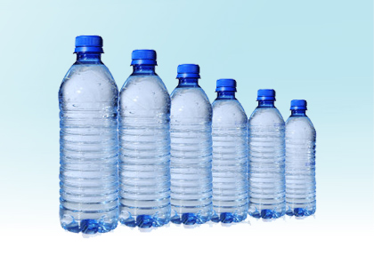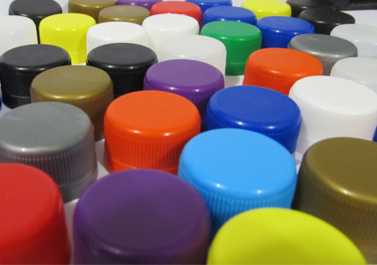 Botellas PET de varios estilos, colores y tamaños y diversos colores de tapas para botellas.